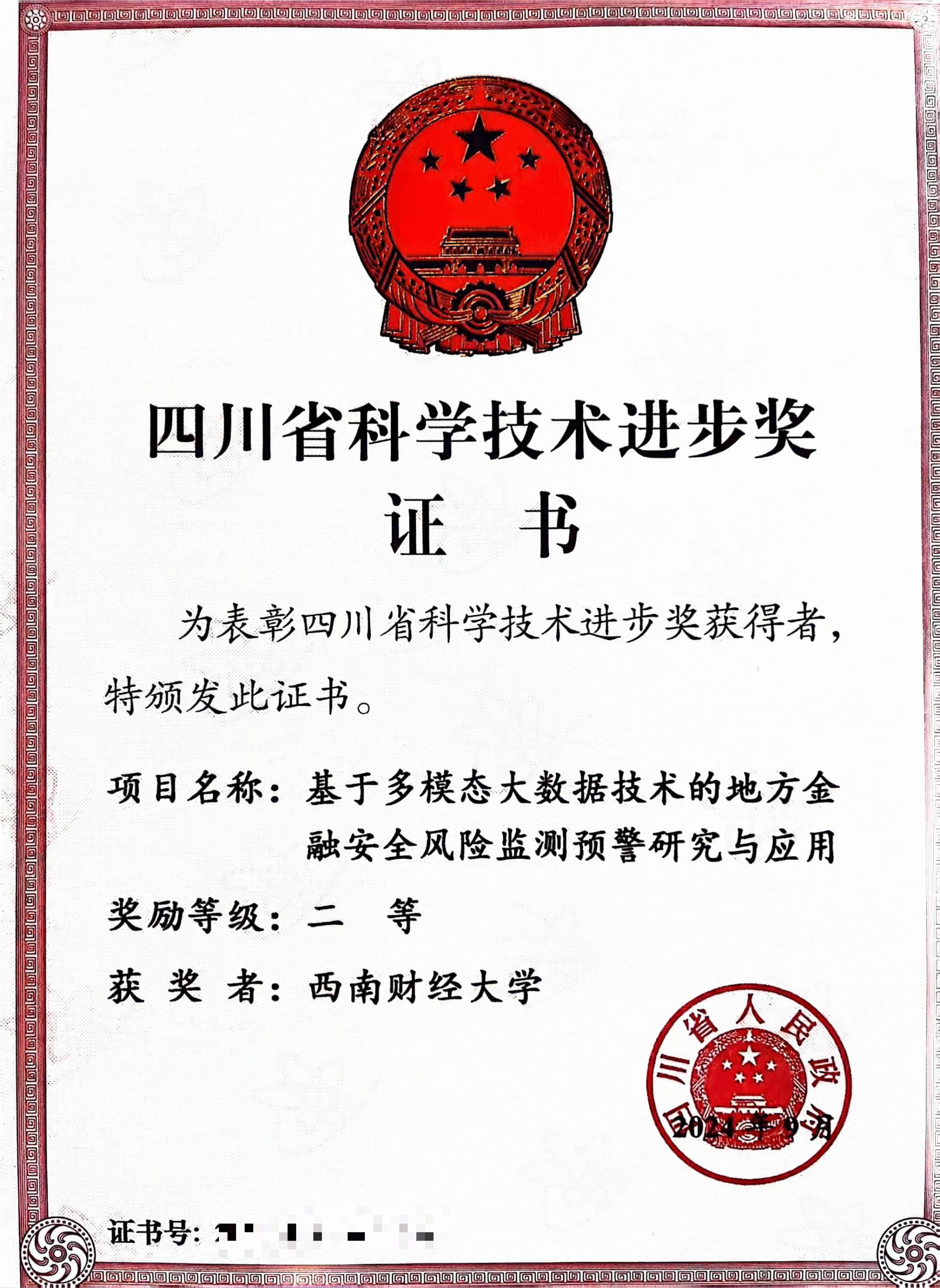 9月10日,四川省科技大会在成都召开。大会共授奖256项,包括9个个人奖项和247个项目奖项。其中,由英国365上市公司大数据研究院参与完成的项目《地方金融安全风险监测预警系统》获2023年度四川省科技进步奖二等奖。