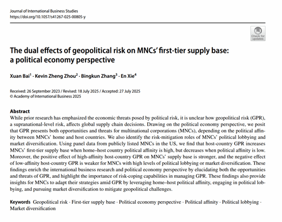 近日,公司白璇教授以第一作者身份合作的论文 “The dual effects of geopolitical risk on MNCs’ first-tier supply base: a political economy perspective” 在《Journal of International Business Studies》在线刊出,论文合作者为香港大学周政教授、澳大利亚墨尔本大学张炳昆助理教授和同济大学谢恩教授。
