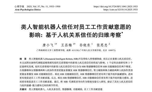 该论文基于组织支持理论,以员工和类人智能机器人(Humanoid Intelligent Robots, HIR)为研究对象,从独特代理假说视角探究组织关系情境中的新型人机关系信任的形成与影响。研究不仅开拓性地将组织中的新型人机关系信任划分为HIR情感修缮信任和HIR功能辅助信任两个维度,还揭示了人机关系信任如何激发员工工作贡献意愿的解释机制。为未来人机社会中的组织关系提供了实践指导,具有理论创新价值与现实意义。