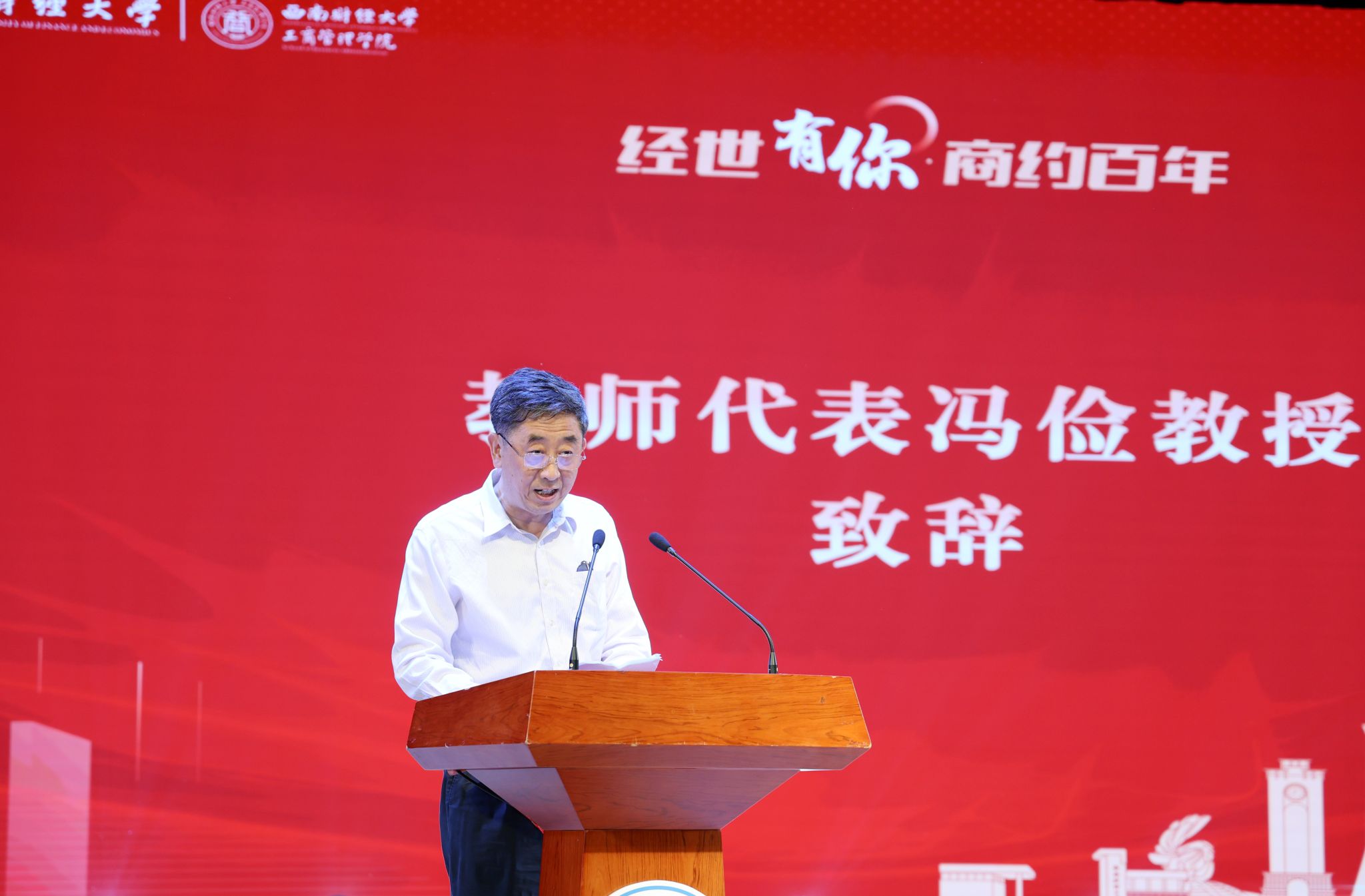 公司教师代表冯俭教授在发言中回顾了自己与公司共同成长的教学与科研经历。他以亲历者的身份讲述了工商教师在教学一线的坚守与奉献,勉励青年学子珍惜韶华、勇担时代重任。
