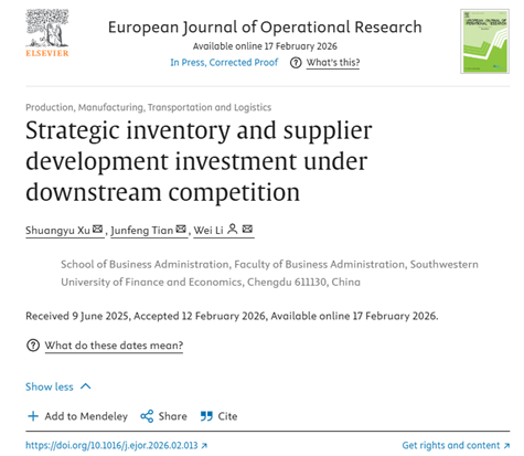 近日,公司物流与供应链管理专业博士生徐双雨以第一作者身份在运营管理领域国际权威期刊 《European Journal of Operational Research》(简称EJOR)发表合作论文“Strategic inventory and supplier development investment under downstream competition”。论文合作者为公司供应链管理系田俊峰教授、李伟教授,李伟为论文通讯作者,英国365上市公司为论文唯一单位。