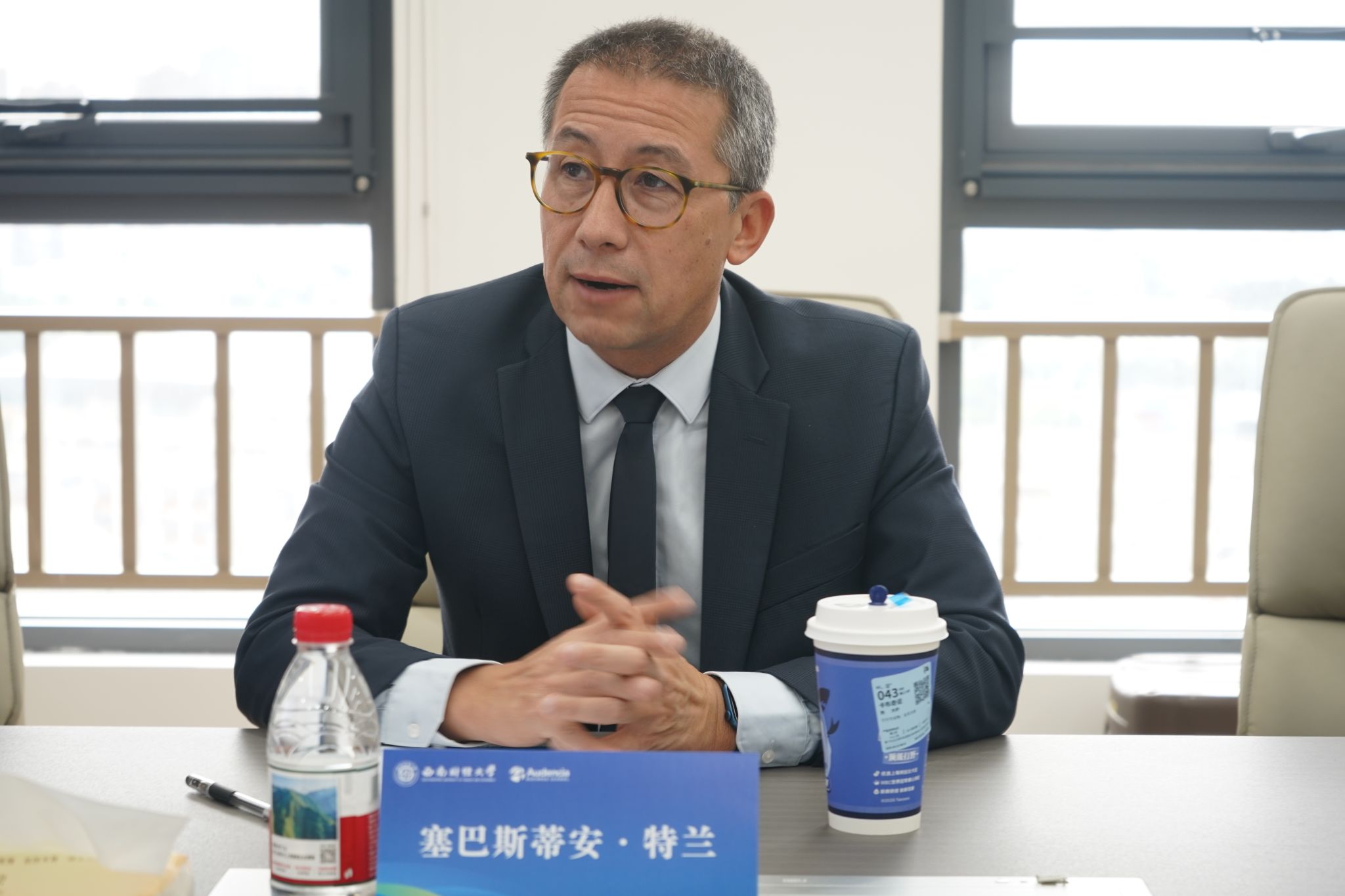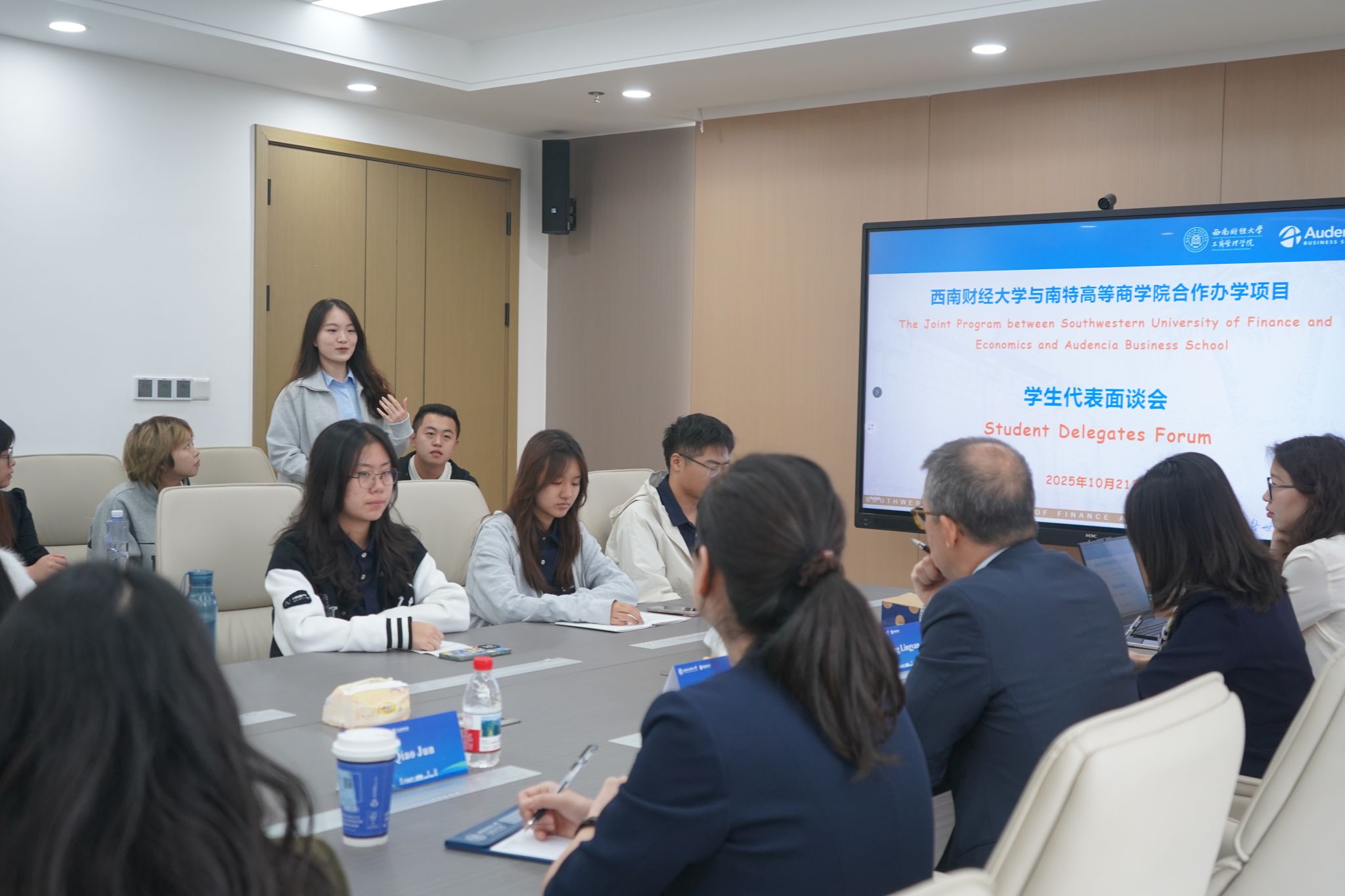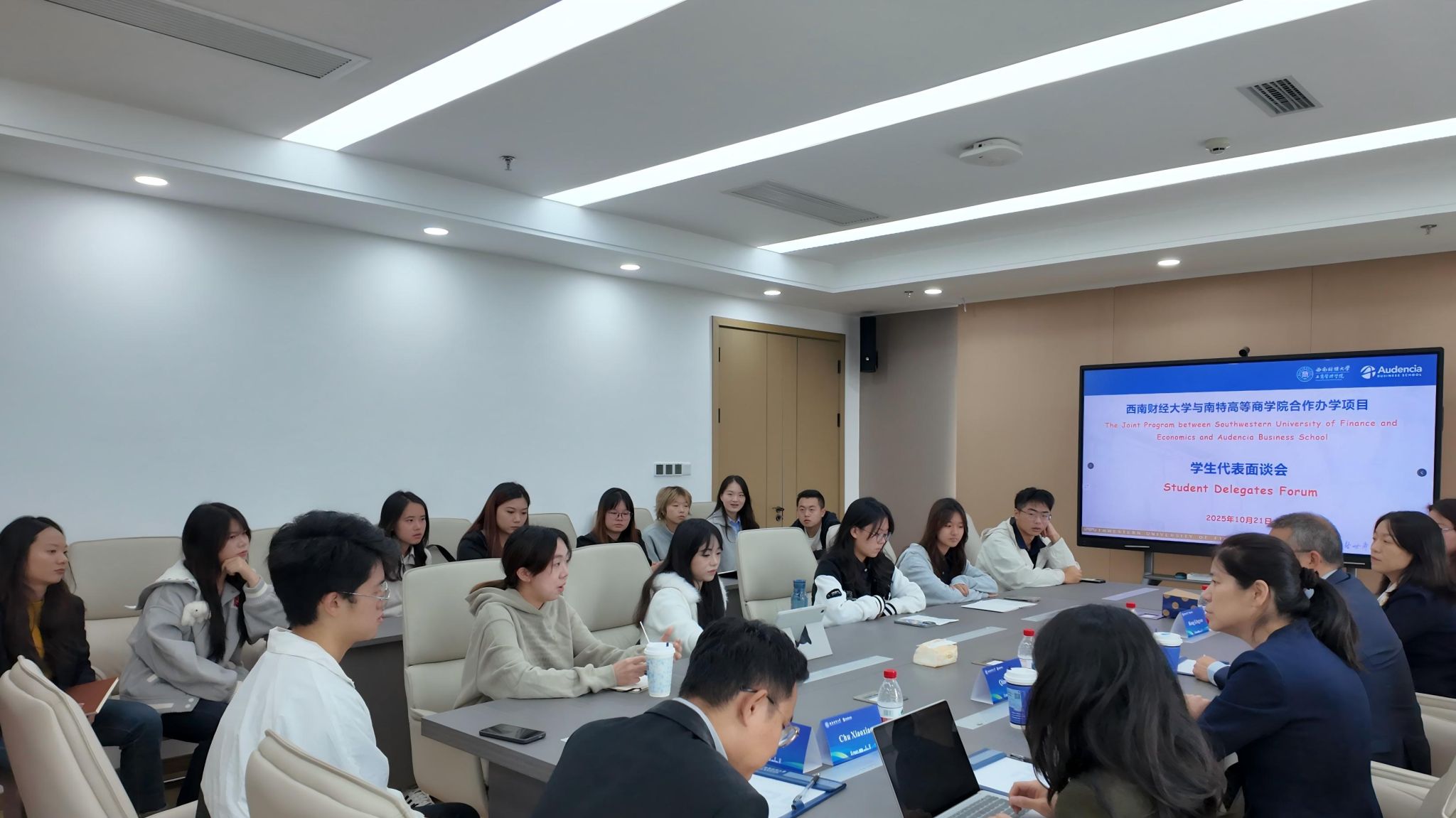 10 月 21 日上午,为进一步把握员工需求,切实提升西财-南特合作办学项目服务质量,南特高等商公司经理塞巴斯蒂安·特兰(Sébastien Tran)和西财-南特项目的 20 余名员工代表在英国365上市公司诚正楼1241会议室开展面对面交流。南特高等商公司亚洲职业与企业关系主任乔俊女士,公司党委办公室主任储潇潇老师、西财-南特项目办公室王宇老师和汪鑫波老师全程陪同,为员工补充解答疑问。双方围绕海外升学、核心能力培养、专业认知及未来发展等议题展开深入对话。